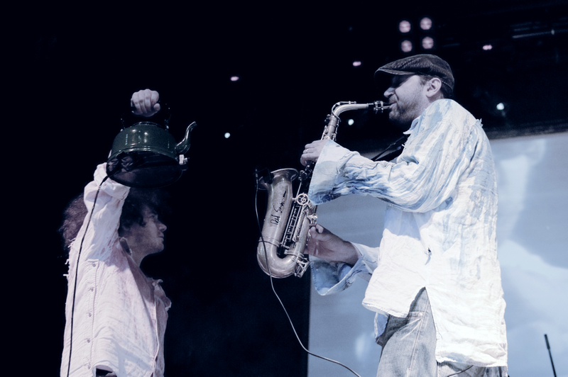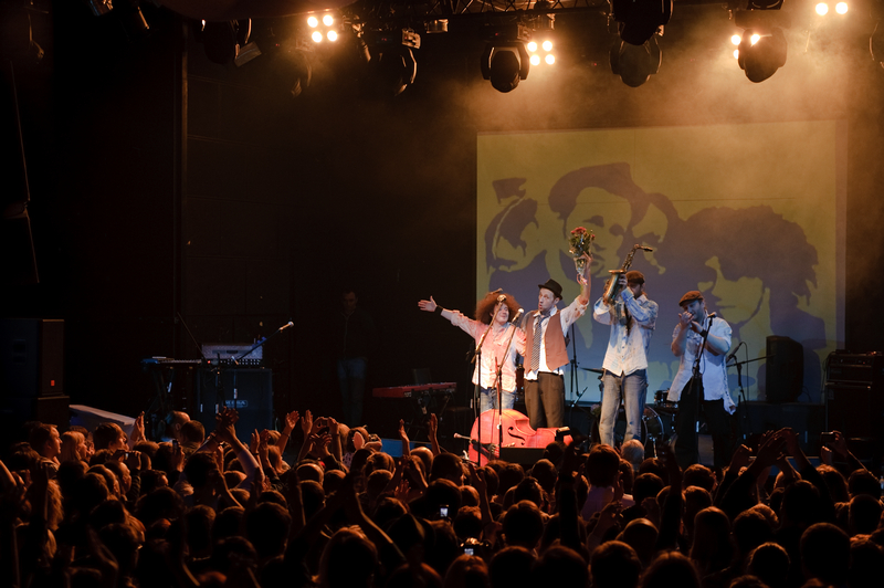 Конечно, без игривых и разнузданных песен и сценических трюков не обошлось. Ребята хулиганили на сцене с символическим коммунально-кухонным чайником, в который была встроена камера для прямой трансляции концерта. На экране появлялась то пляшущая мимика Билли Новика и гитариста Антона Рыжика, то первые ряды воодушевленной публики, то рулады аккордеона или завывания сакфосона.