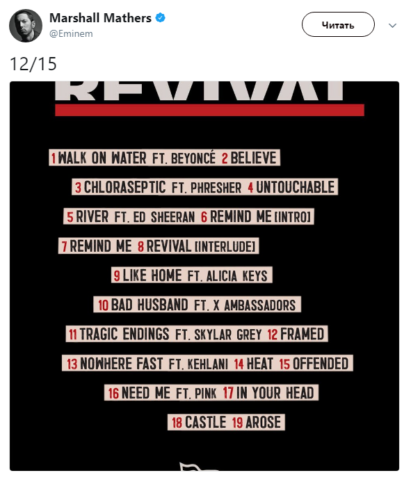 Только что в своем официальном Twitter-аккаунте Eminem опубликовал подробный треклист девятого студиного альбома. Как сообщалось ранее, пластинка будет называться «Revival», ее официальная премьера состоится 15 декабря.